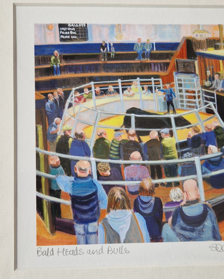 Bald Heads and Bulls 30cms x 30cmx (total mount size) mounted in a cream mount and ready for you to frame, giclee print of this iconic livestock auction scene. You can smell the banter, sawdust and hear the unfathomable chant of the auctioneer.