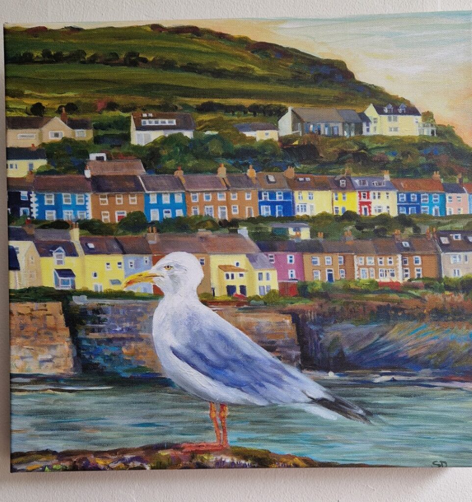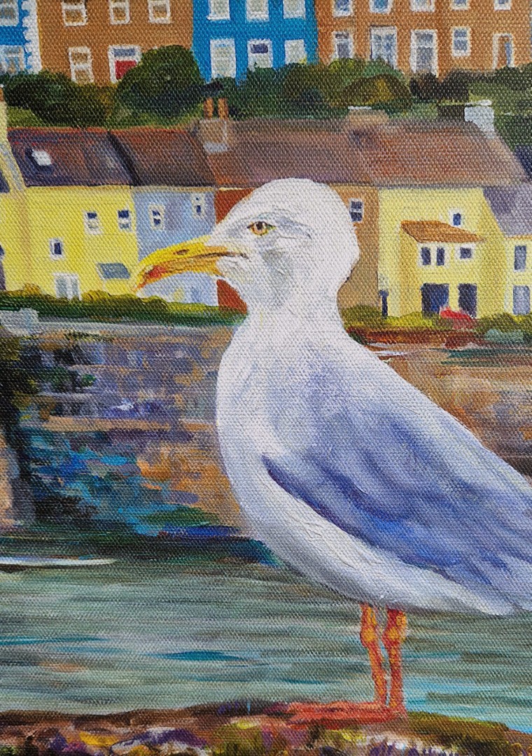 Print on canvas of this chancer always on alert to nab your chips. Seagull painted from the harbour wall in magnificent New Quay, Wales (Cei Newydd).