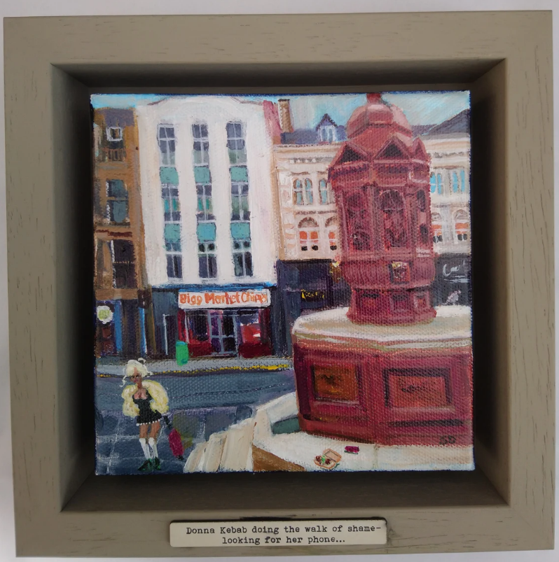 Caption written on tag on bottom of the frame reads ‘Donna Kebab doing the walk of shame – looking for her phone…’ and depicts Donna wandering around the Bigg Market the morning after a night on the Toon, her phone is next to a discarded kebab by the water fountain. Of course Donna feels no shame she is an empowered, strong woman.