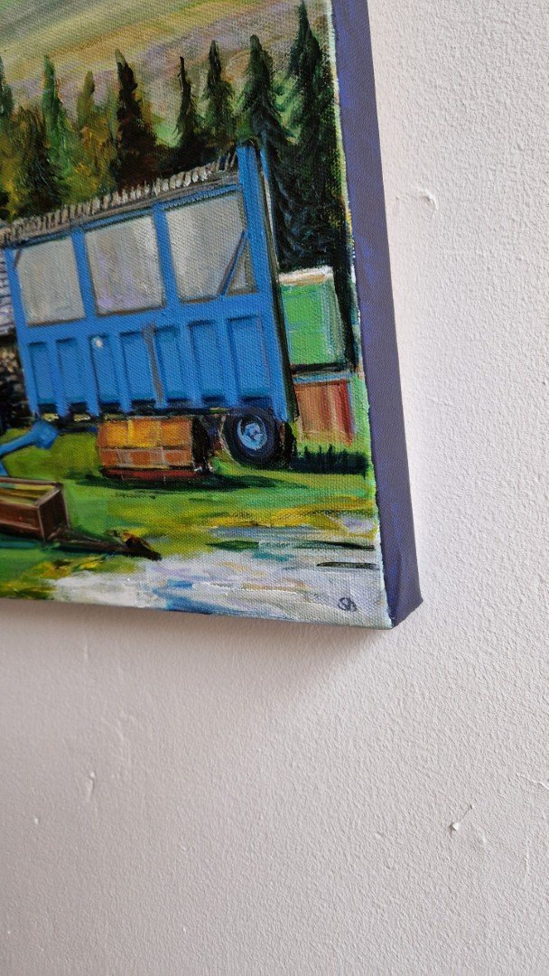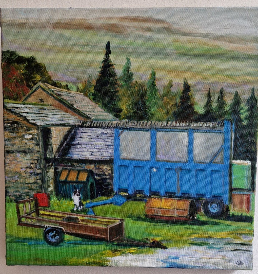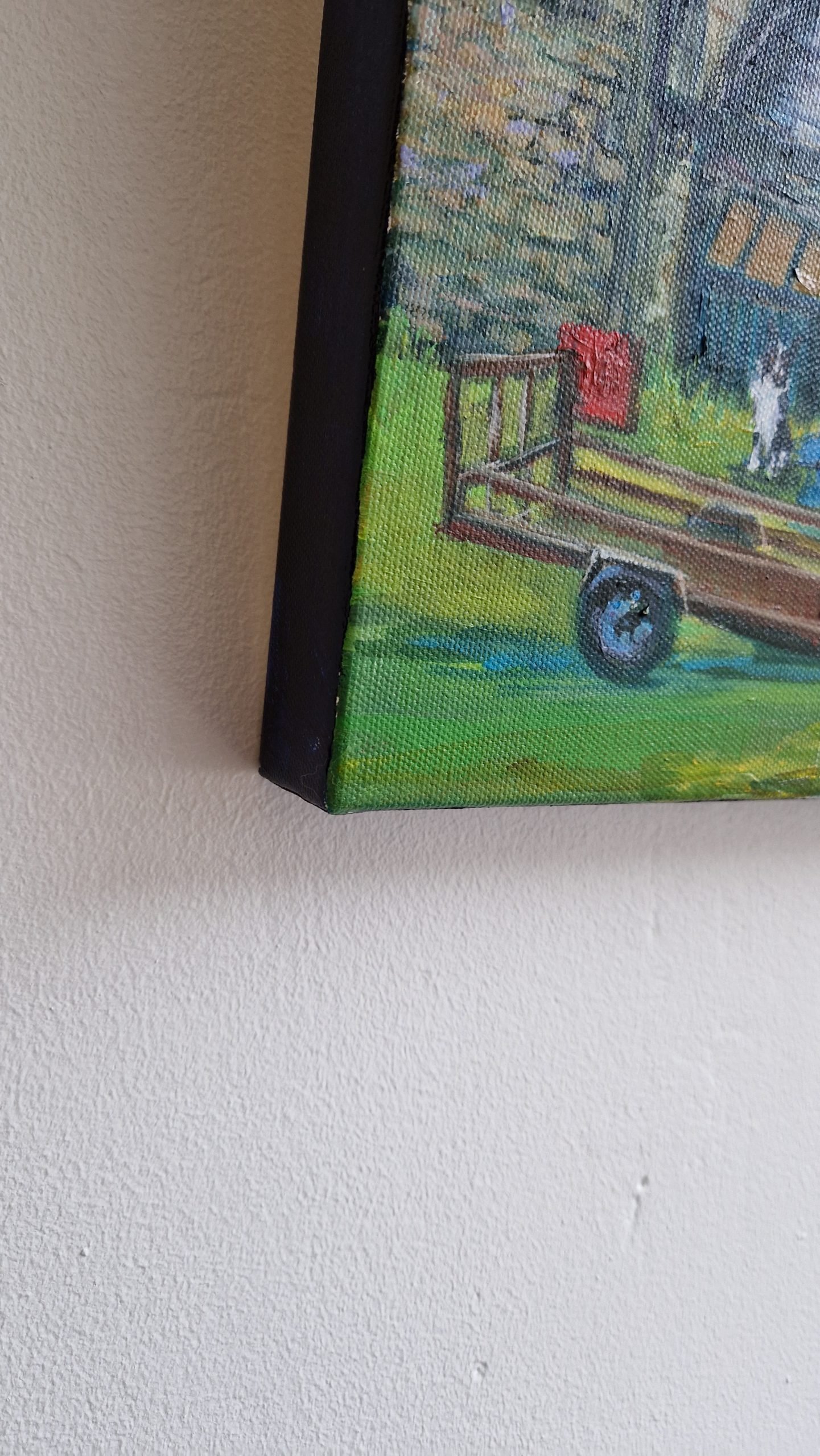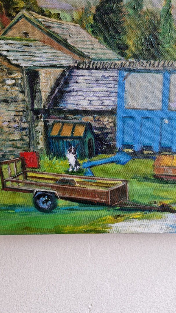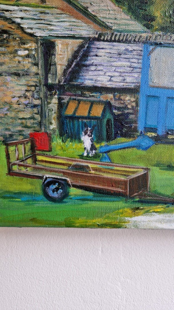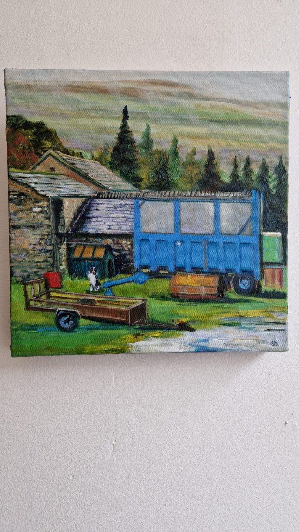 A slice of farm life, a working yard complete with collie, trailer and barn. I try and paint the smell of a scene…usually! I wanted this view to be evocative of an authentic farmyard you might happen upon on a walk.