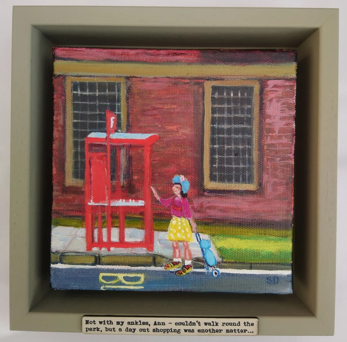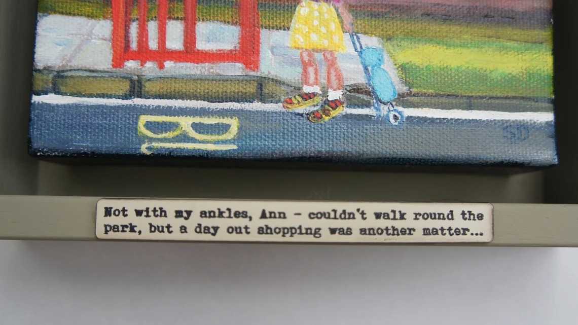 Original painting of Ann, framed in a hand-painted chunky shadow frame with caption ‘Not with my ankles, Ann – couldn’t walk round the park, but a day out shopping was another matter…’