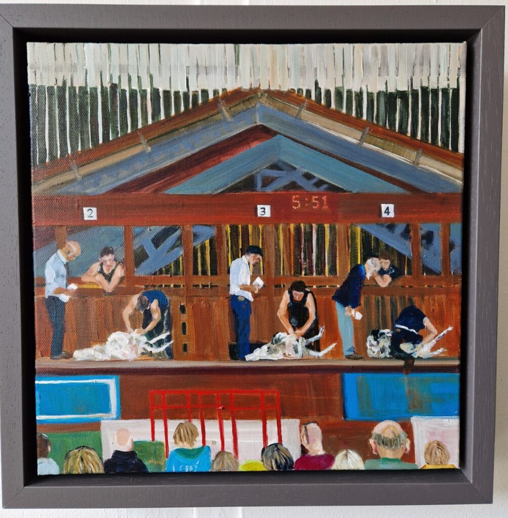 A painting of a shearing competition at a country show. I love capturing the farming calendar and these competitions are ferocious, fast and furious. Skills handed down through generations.
