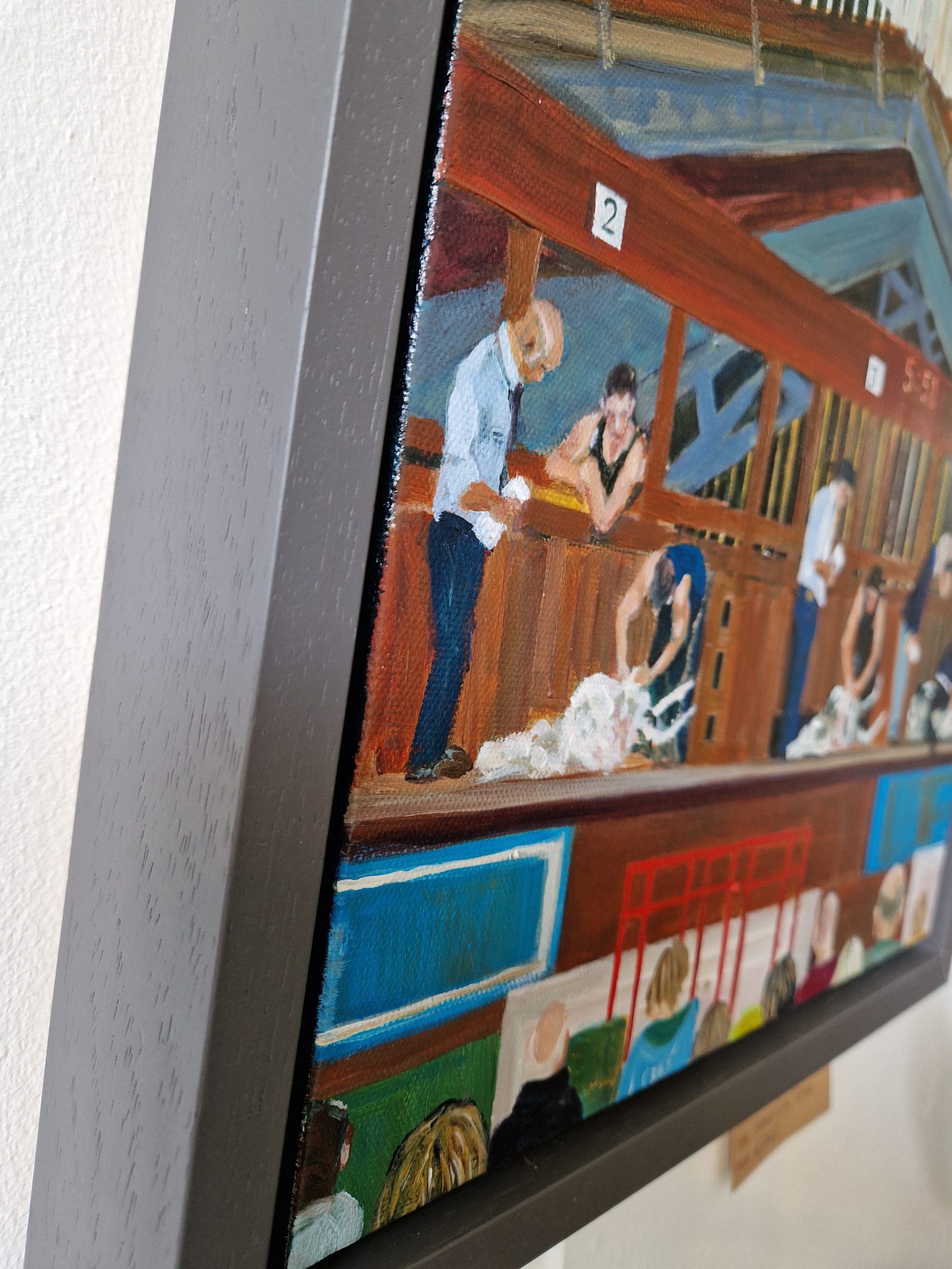 This original, acrylic is painted on a boxed canvas and framed in a grey floating frame, ready to hang on your wall. It measures 35 cms x 35 cms.