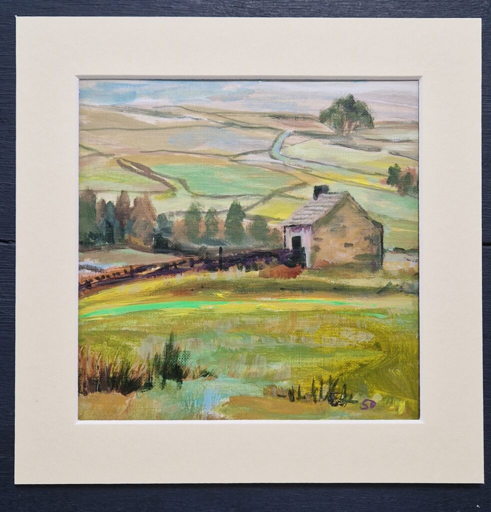 Original landscape painting of a stone shepherd’s Hut with moor stretching ahead on a dull day with a hint of blue sky poking through.