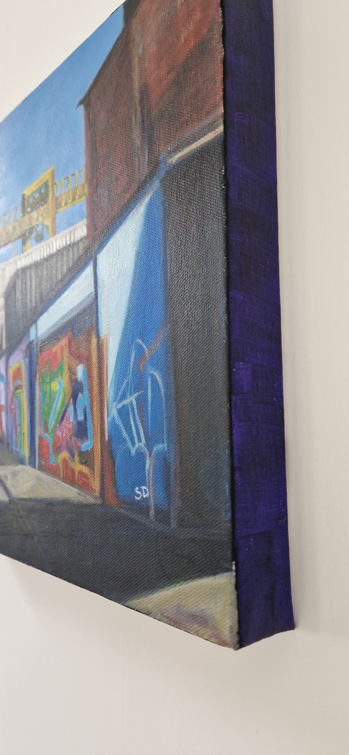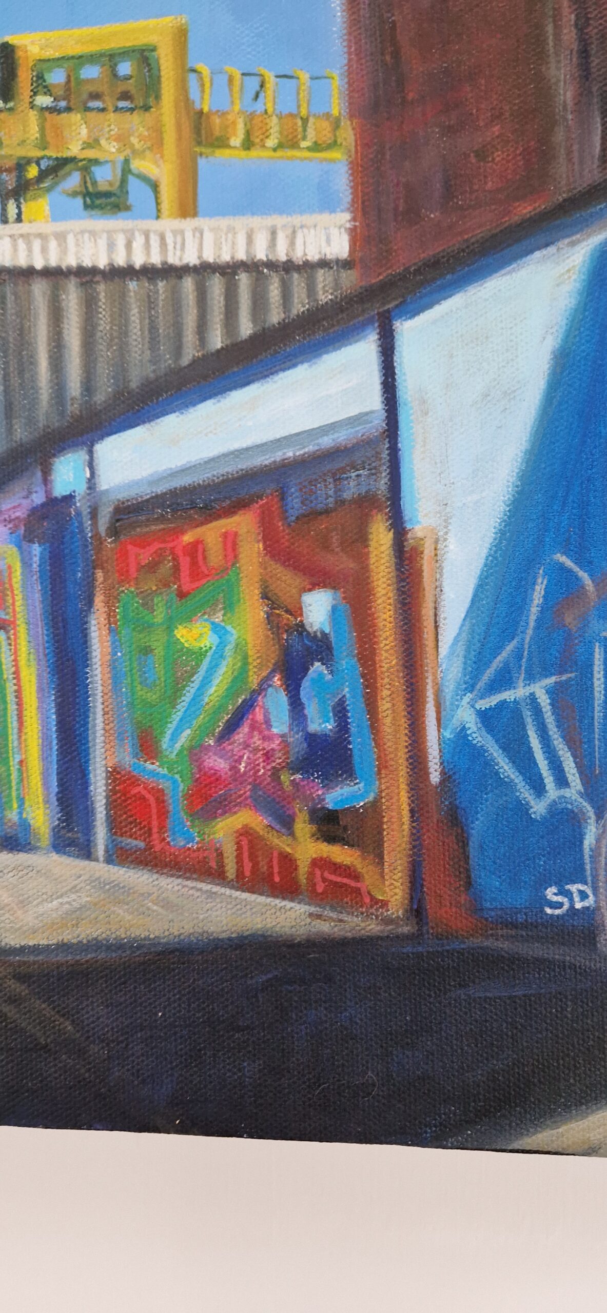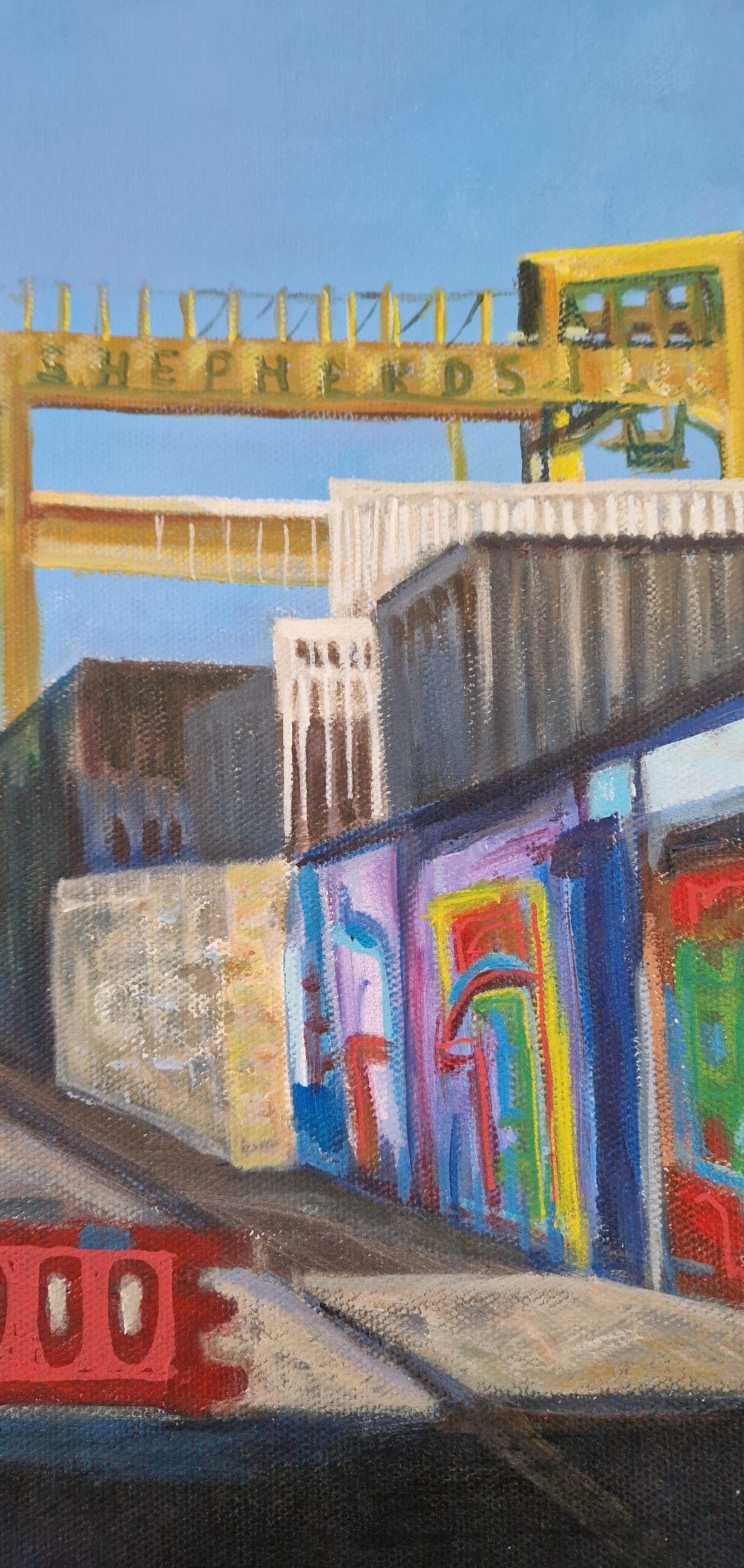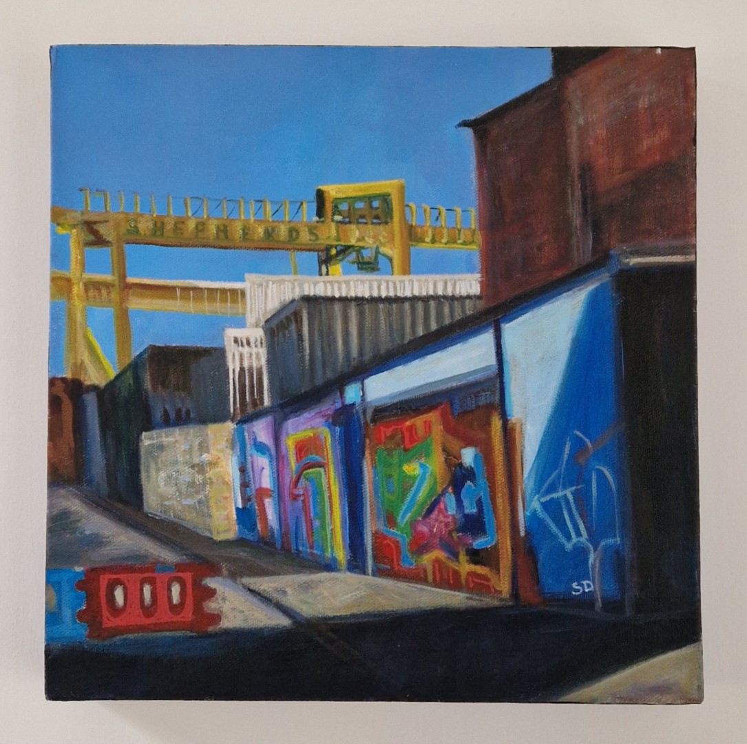 A colourful painting of the graffiti looking towards Shepherds Scrap Yard, Byker Bank with a bright blue sky as a backdrop. A nostalgic piece celebrating one moment in time of this areas historical past