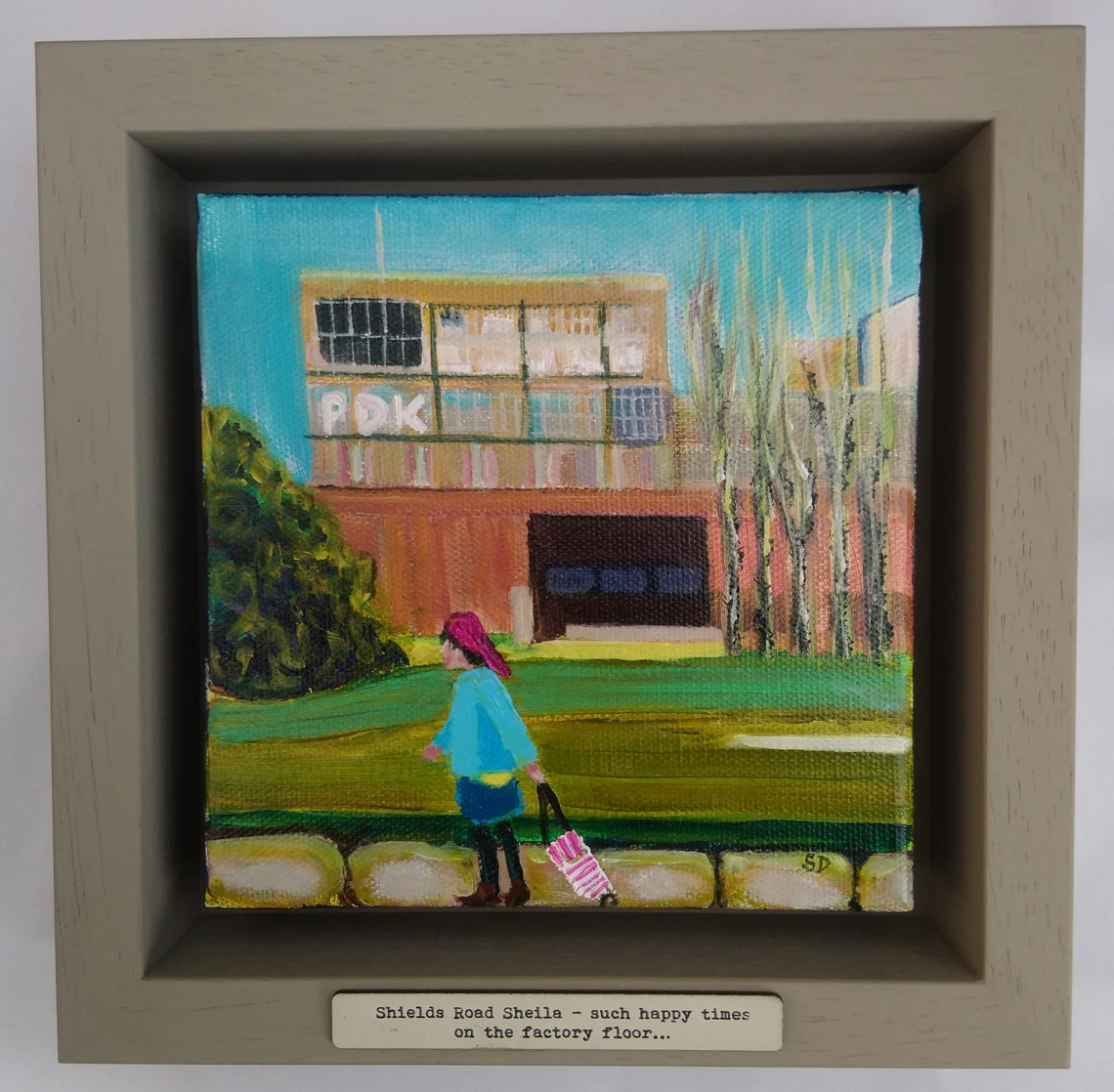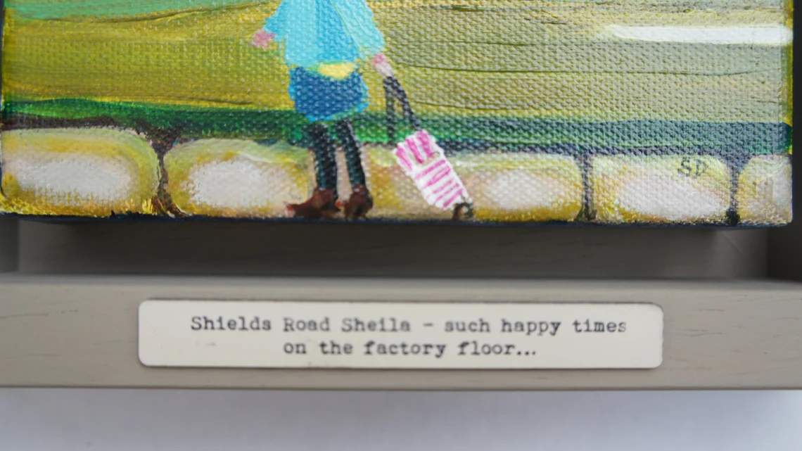 Original painting on canvas of ‘Shields Road Sheila- such happy times on the factory floor…’ one of the Owd Lasses reminiscing about her working life.