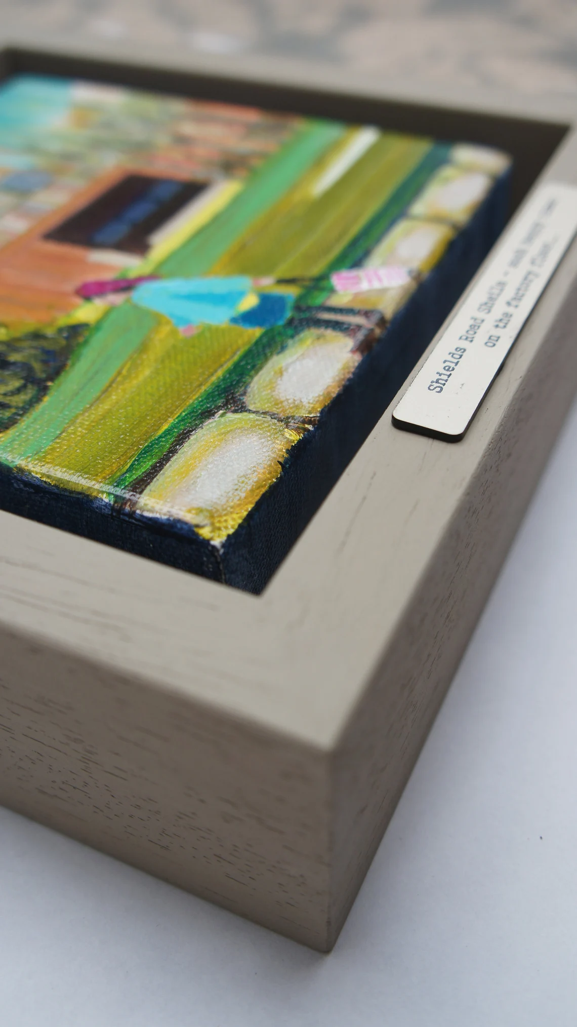 Framed in a green/grey hand painted chunky, wooden, shadow-frame with the caption on the bottom.