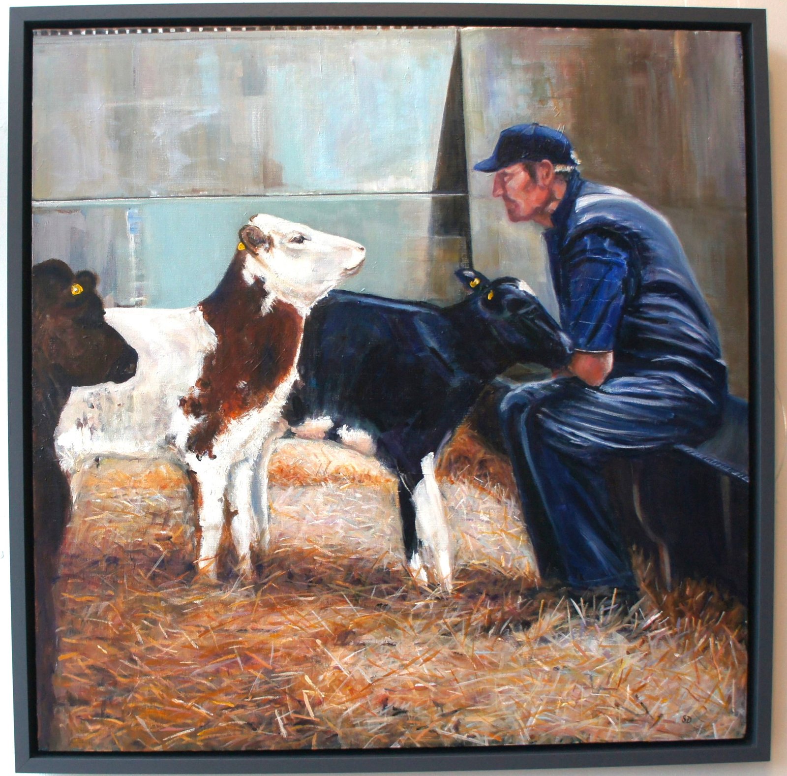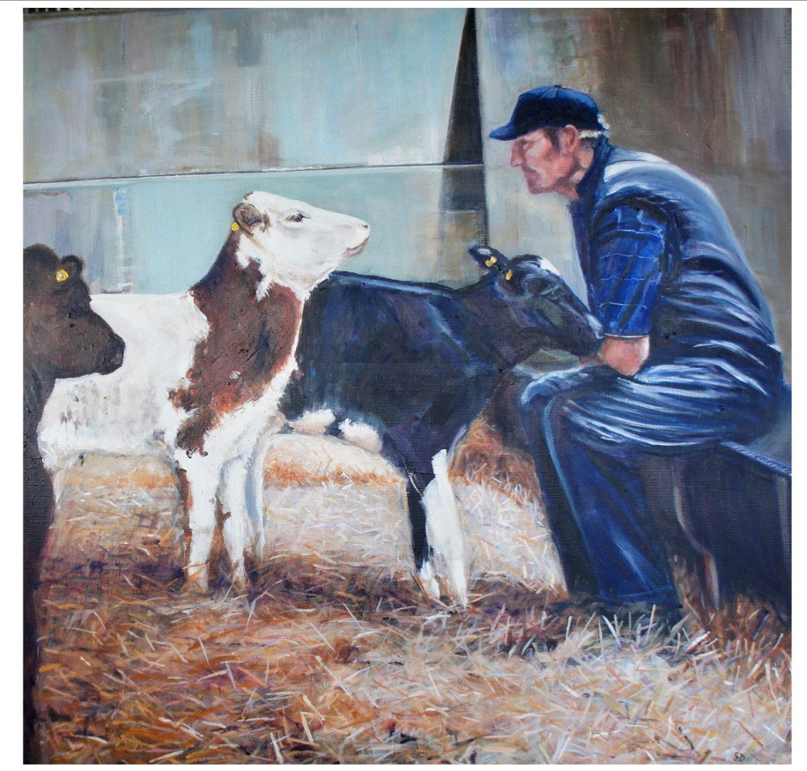 I painted this work while artist in residence on a local farm, where I was able to spend time quietly observing the daily rhythms of farm life. One afternoon I noticed this farmer sitting calmly in the barn while several young calves gathered around him, each one edging closer in gentle competition for his attention.